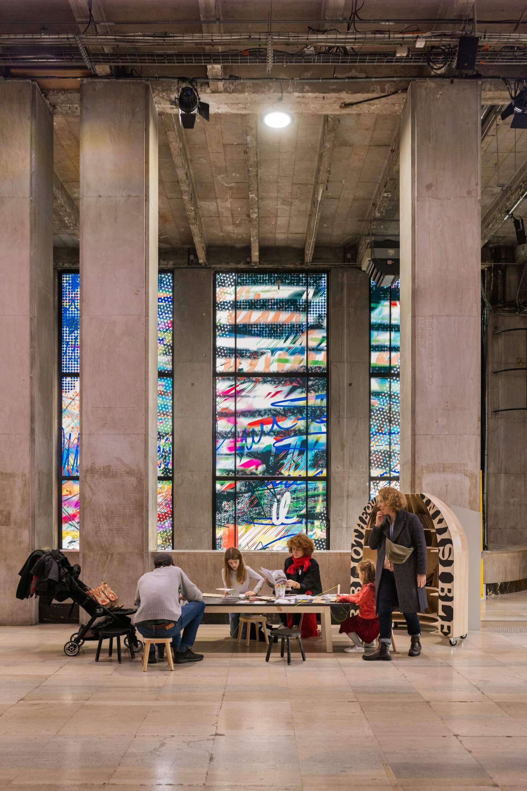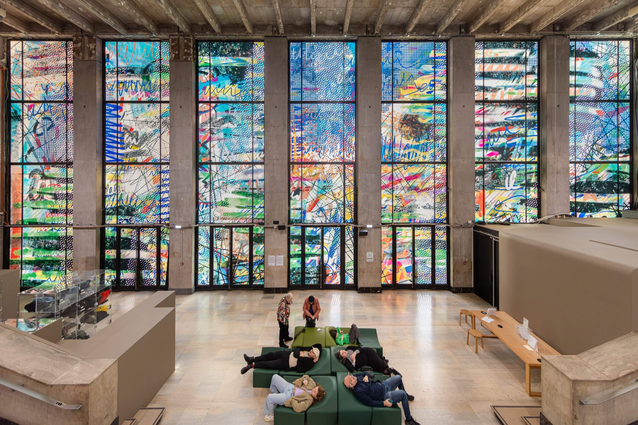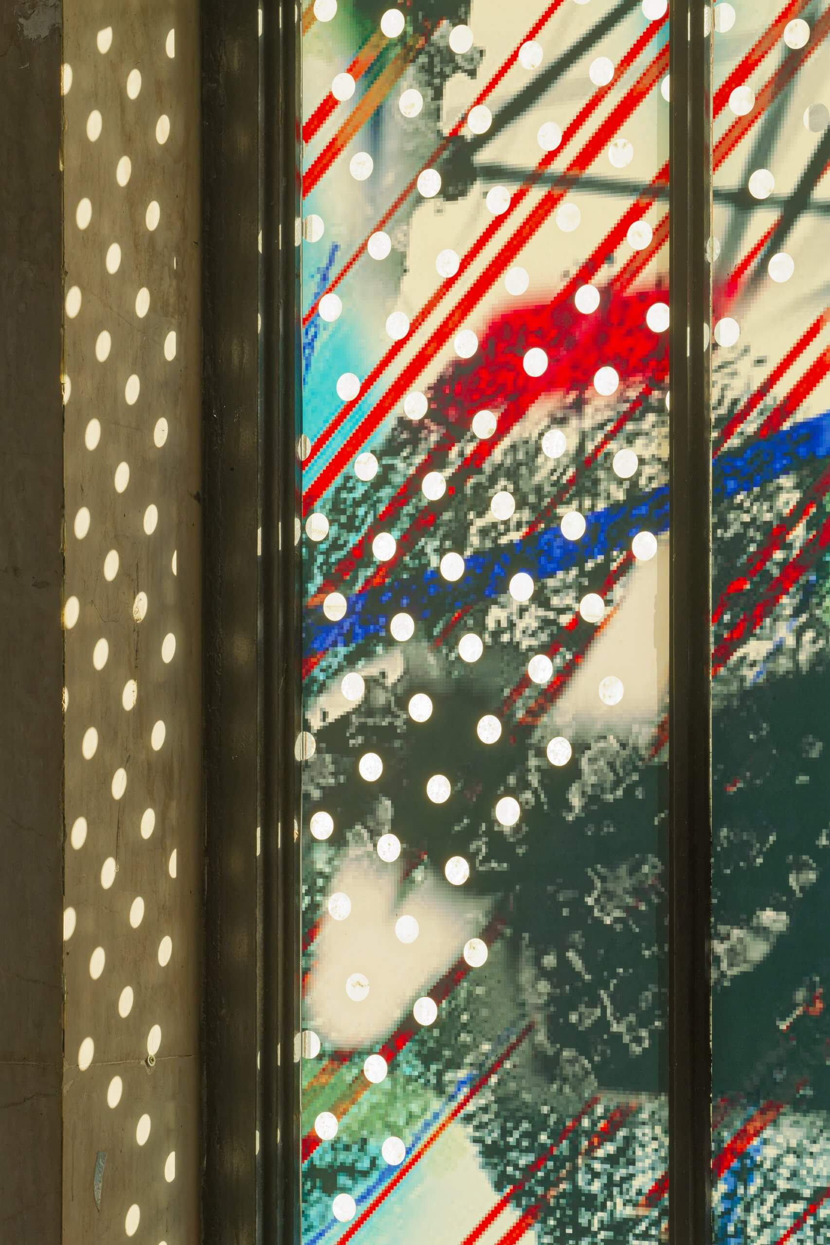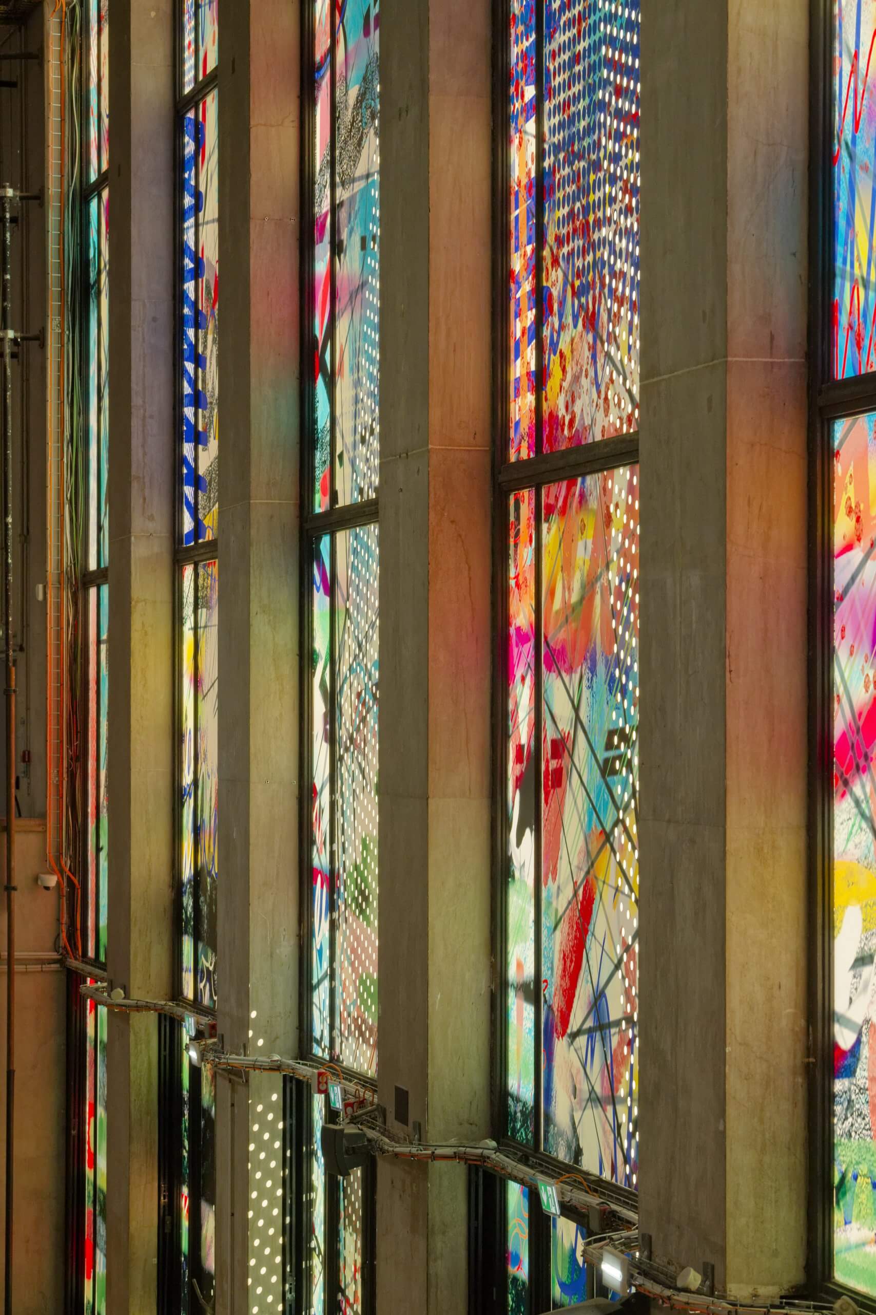 Invitée à déployer sa peinture dans La Zone – l’espace d’accueil gratuit du Palais de Tokyo, Renée Levi élargit l’espace qui sert habituellement de passage et le redéfinit en l’étirant entre un vitrail plein format conçu numériquement et une peinture murale analogique. Sur la façade vitrée, le blanc devient le fond de la couleur, tandis que sur les murs, il est réservé aux signes et à la signature. Entre opacité et translucidité, gestes, ratures et écritures viennent révéler leur environnement et faire corps avec les teintes des pierres et des marbres, la verticalité et la transparence des vitres, la structure brute du bâtiment. Ici et là, les tracés numériques deviennent des reflets picturaux, les voyelles d’un prénom tournoient en boucles d’argent ou de fumée, les signes deviennent des lettres, les accents des lignes de fuite, le langage une abstraction, et ensemble une nouvelle langue.