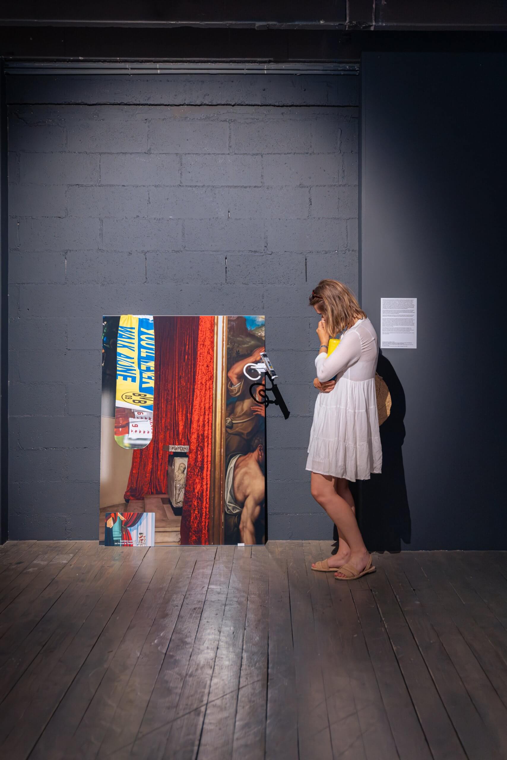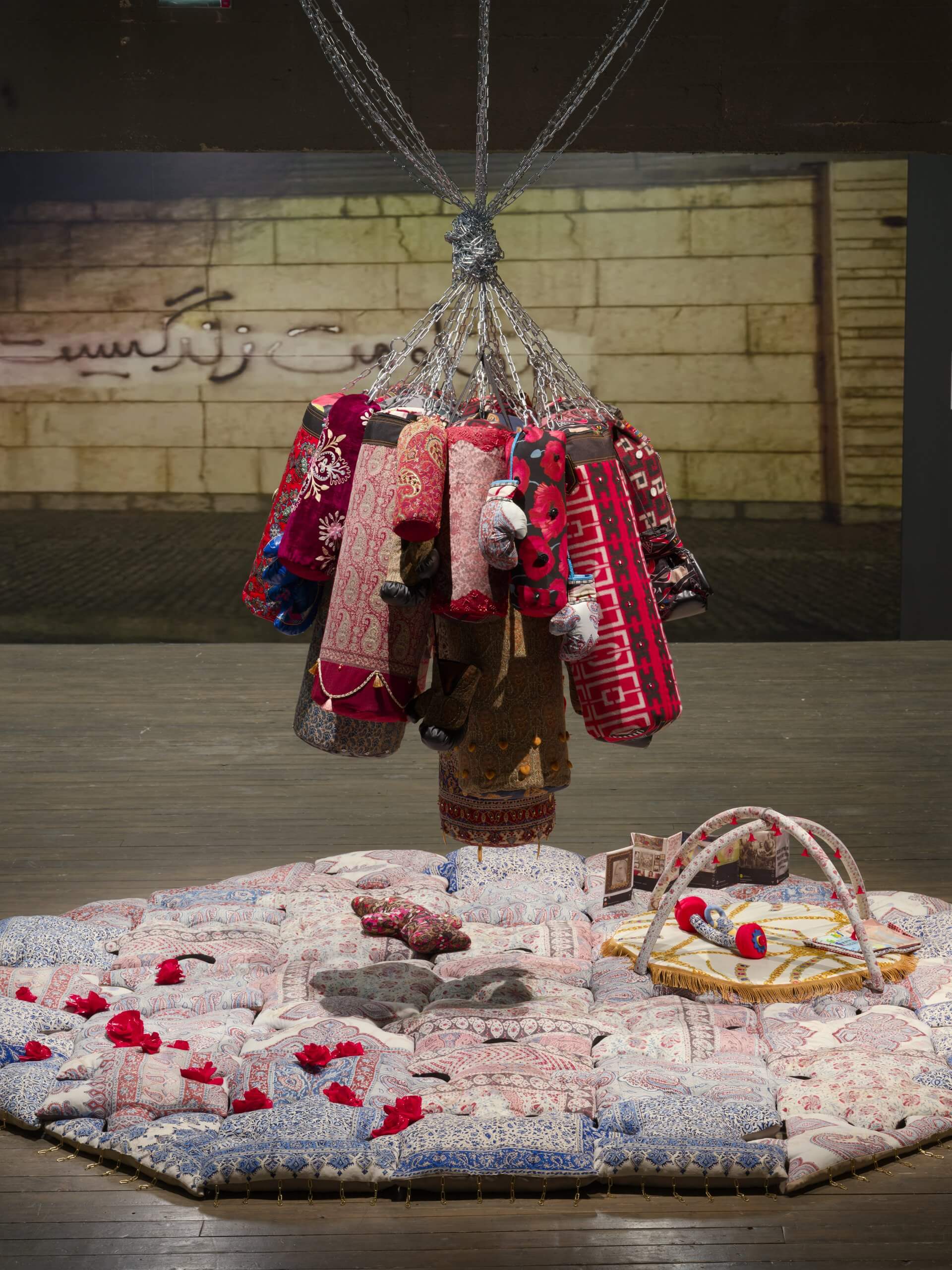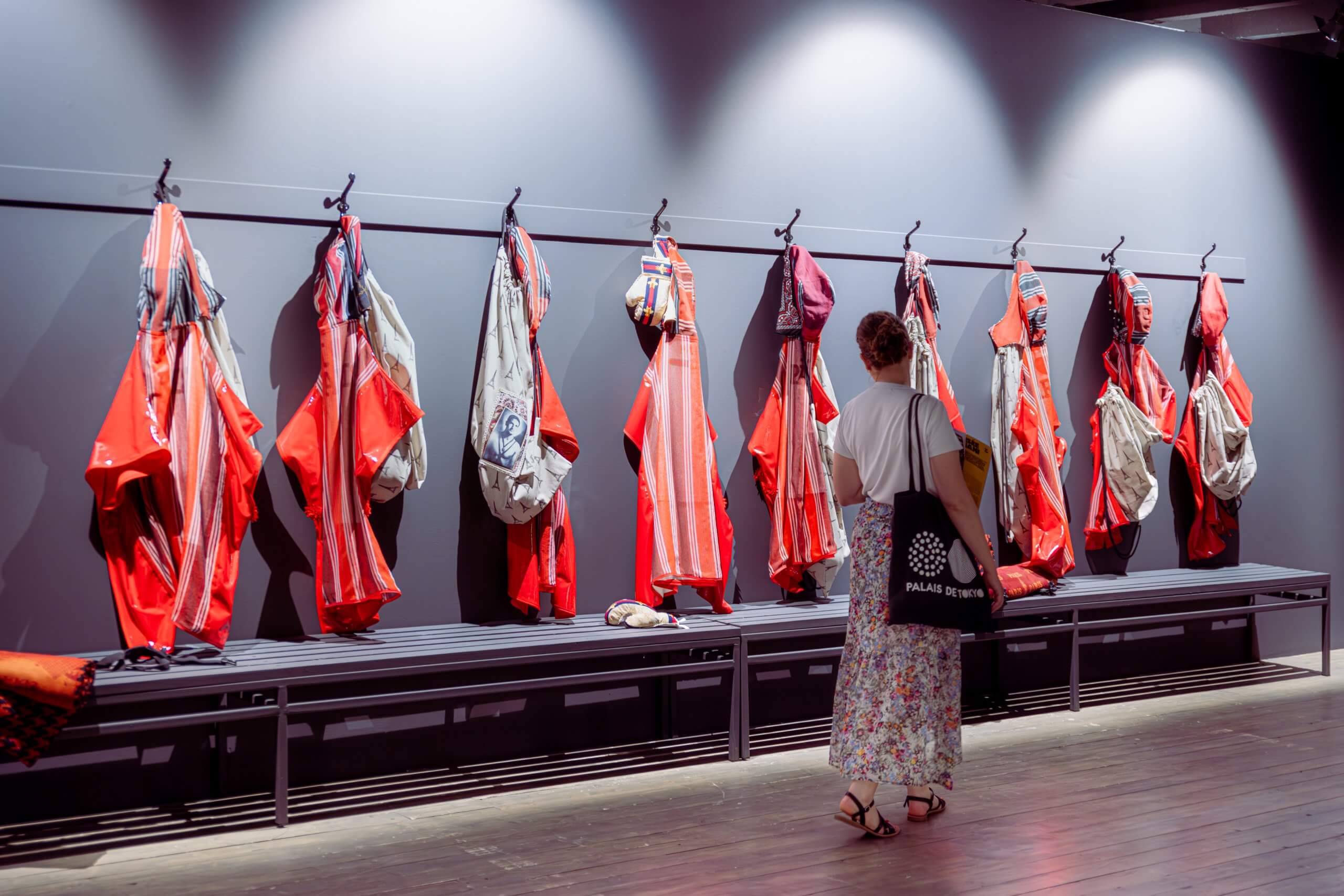 Chalisée Naamani crée des « vêtements-images » à partir de photographies qu’elle prend avec son téléphone ou récupère sur Internet, et dont elle fait de grands collages numériques, qu’elle imprime ensuite sur différents supports. Pour son exposition au Palais de Tokyo, l’artiste a pensé une installation in situ à l’aide d’associations d’images et de sculptures composites qui explorent les multiples manières de construire son corps. Pour son exposition au Palais de Tokyo, l’artiste franco-iranienne s’est laissé guider par les volées de marche et la forme géométrique apparemment incomplète de l’espace. Y devinant un octogone à moitié et un lointain écho du zurkhaneh iranien – terme désignant tout à la fois un sport et le gymnase dans lequel se pratique cette discipline nationale cousine de la musculation, de la lutte et de la résistance aux invasions ennemies –, la plasticienne s’amuse à en épouser les formes et à les faire résonner autrement.