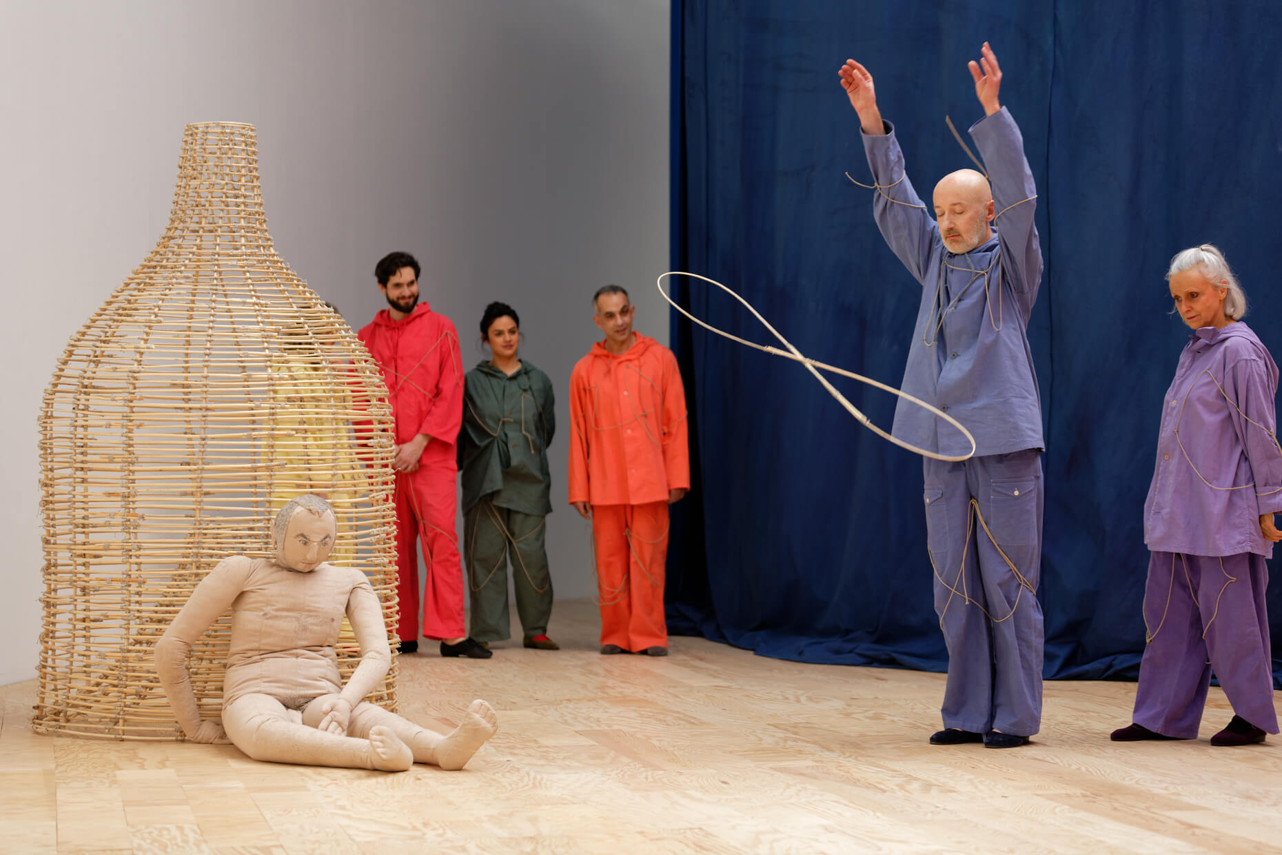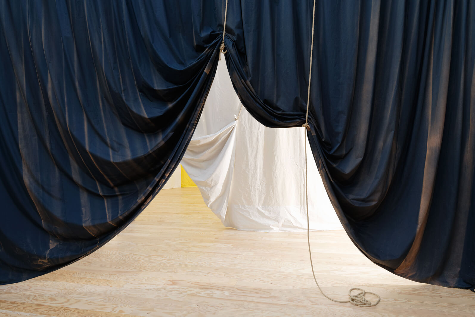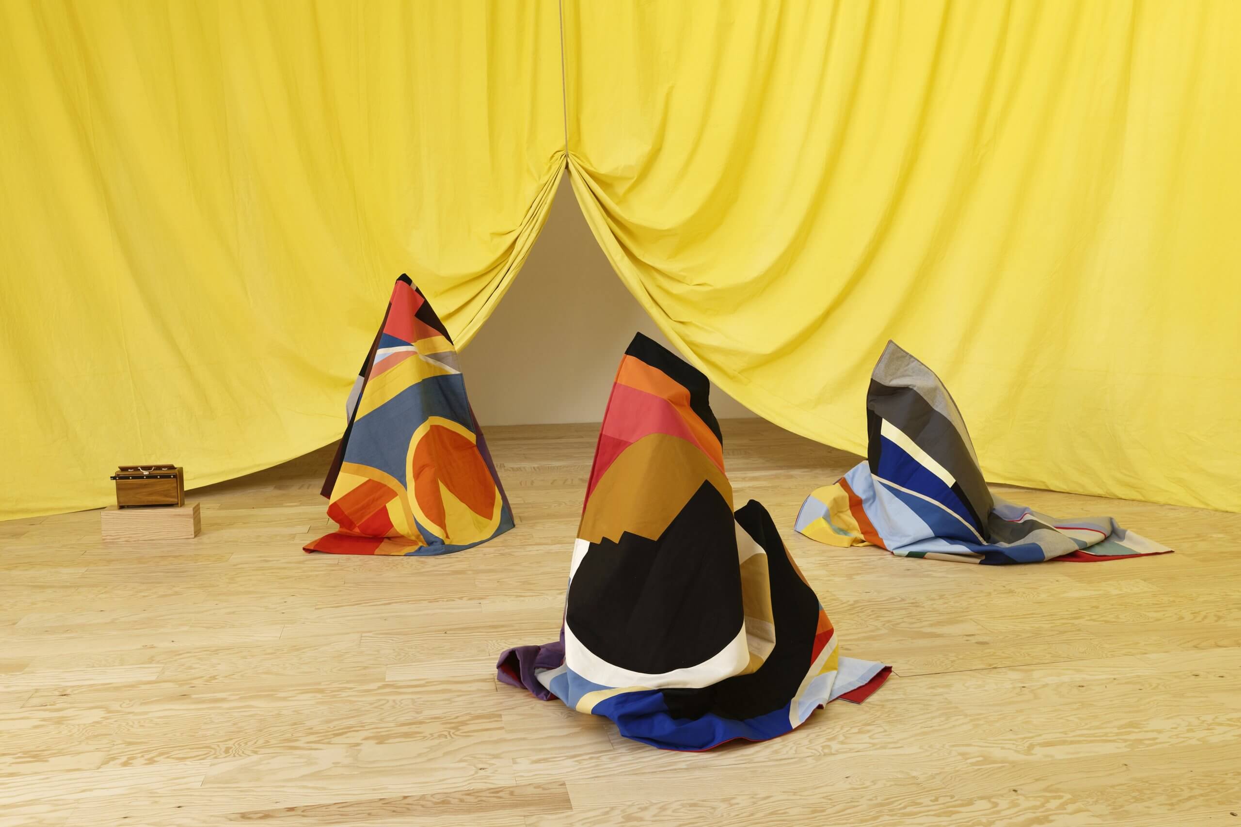 Ce double rapport à l’image, à la construction d’un cadre de représentation et à l’engagement du corps se poursuit dans une très grande installation textile, qui met par ailleurs à jour l’intérêt de l’artiste pour ce matériau transportable et modulable, qui circule, s’échange et se métamorphose au fil des époques et des communautés qui le produisent. Celle-ci se déploie à travers cinq environnements réalisés avec des tissus colorés provenant de pièces antérieures de l’artiste. Chacune de ces cabanes à la géométrie incertaine est dotée d’une fonction ou d’une temporalité : action, figure, rituel, nuit, habitat. Chaque samedi pendant toute la durée de l’exposition, cinq danseur.se.s construisent et déconstruisent ces espaces en manipulant à travers un certain nombre d’actions ritualisées les œuvres-accessoires qui y sont présentées : morceaux de craie surdimensionnés, cordes, cannes à pêche, quilts, poupées jumelles des interprètes, bols, botte de foin, nasses, tissus déchirés envahissant progressivement le sol, etc. L’exposition affirme ainsi sa capacité de transformation, créant des récits sans cesse renouvelés, des combinaisons singulières.