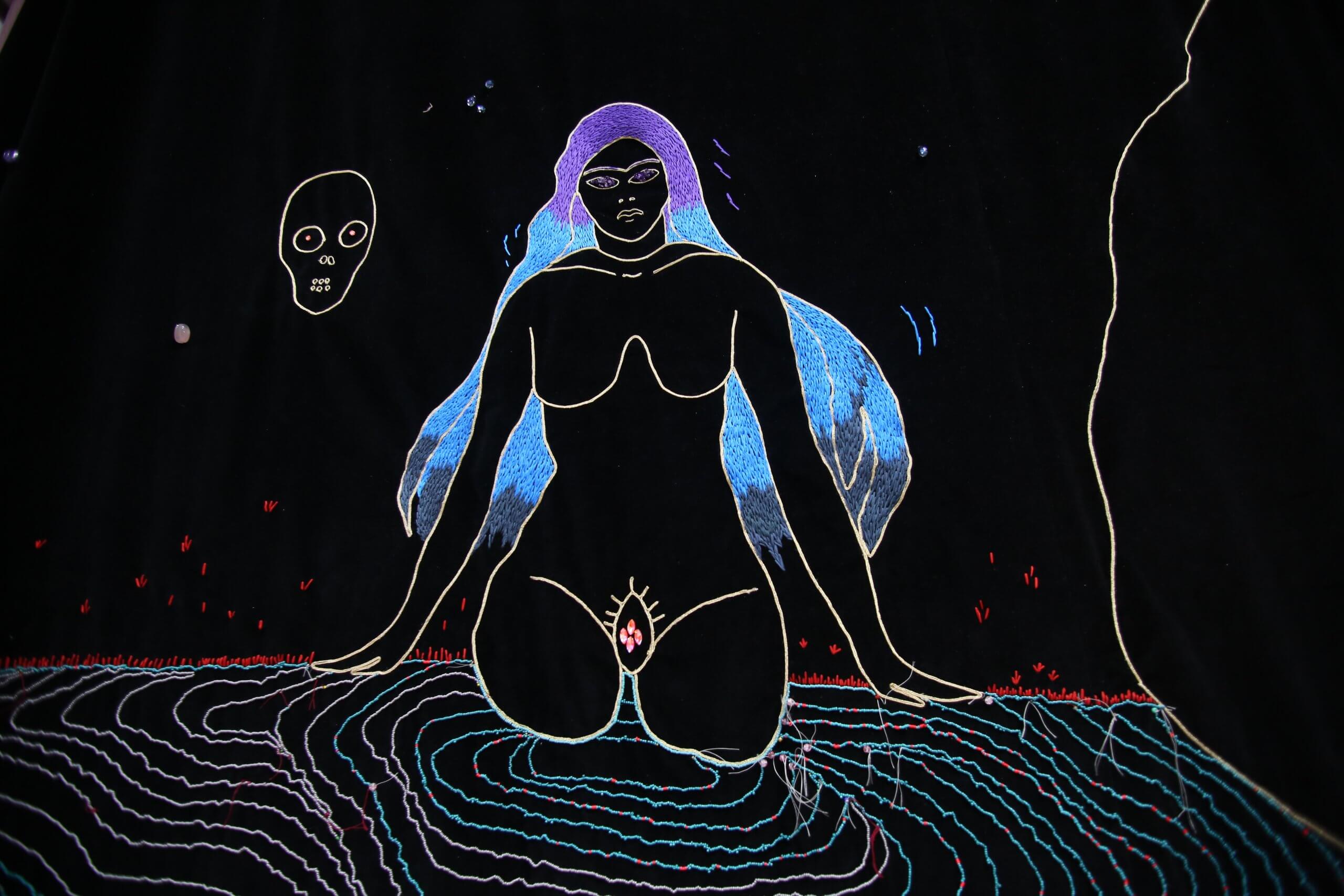 Dalila Dalléas Bouzar : Tout d’abord, je suis tombée sur des photos de peintures rupestres du Tassili et j’ai halluciné devant certains dessins. Quand j’ai appris que c’était en Algérie, j’ai encore plus été interpellée parce qu’à part son histoire politique, on ne sait pas grand-chose de ce territoire. J’ai donc voulu m’y rendre, mais c’est assez inaccessible et cher. Le Tassili est en plein coeur du désert, à la frontière libyenne. Quand j’ai eu le prix SAM, la première chose que j’ai faite a donc été d’y aller. Ensuite, ma première motivation a été de partager cette connaissance avec ce que je sais faire, c’est-à-dire un objet artistique. J’avais déjà réalisé plusieurs tapisseries liées à l’Algérie avec des matières en lien avec la culture du mariage, de la femme et son corps. Je trouve ça intéressant de se décentrer et de parler de ce territoire en dehors de ce temps contemporain lié à la colonisation et de ce qu’il se passe au niveau géopolitique.