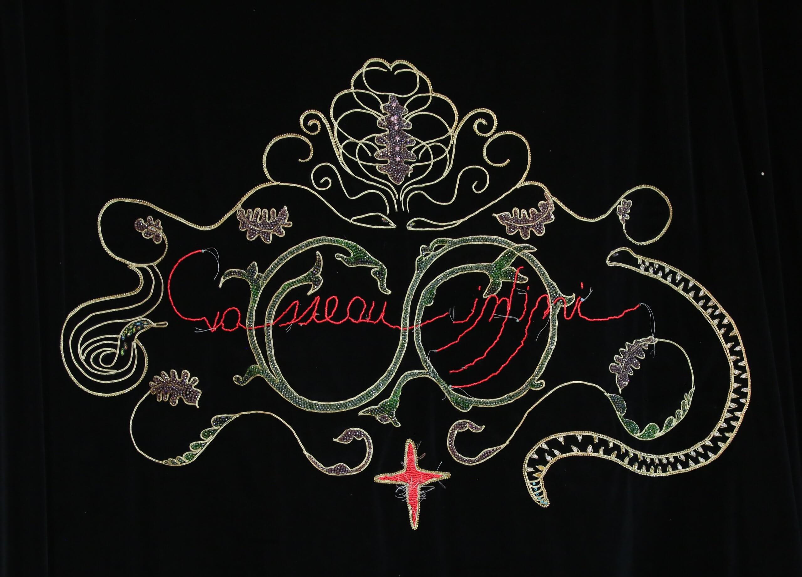 DDB : Ces talismans sont en or massif. Ils parlent de cet or qui se transforme et qui est symbole de pouvoir. J’ai toujours fait attention à ce qu’il y ait de l’or dans mes tapisseries parce que ce métal est connecté à tous ces rituels qui sont liés aux femmes, notamment avec les bijoux, la dot de la mariée. Il y a aussi quatre Louis d’or qui ont été fondus. En Algérie, les Louis d’or qui se transmettent dans les familles sont des Louis d’or Napoléon du début du XIXe siècle qui portent l’inscription « Empire français ».