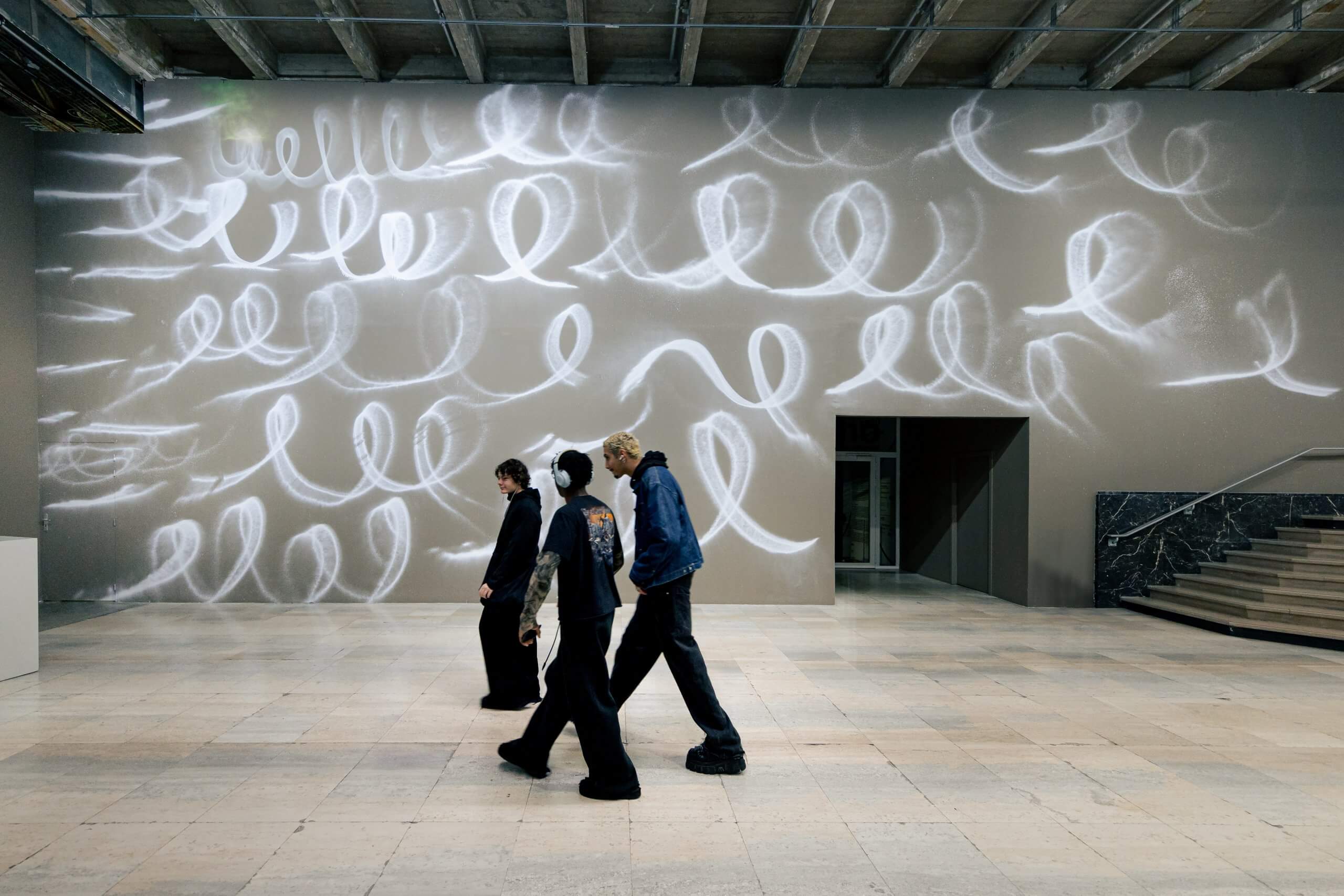 Marcel Schmid : Cet espace est l’entrée du Palais de Tokyo avec ses dimensions monumentales. Parfois, il est intégré aux expositions, parfois c’est seulement un lieu de passage. Nous avons voulu clarifier la situation et montrer qu’il s’agissait d’un espace en soi, qui valait pour lui-même. Nous avons donc décidé de recouvrir tous les murs blancs afin que ces derniers restent réservés aux salles d’expositions et aux murs dédiés à la signalétique du centre d’art. Peindre ces murs, c’était une manière de circonscrire cet espace. Renée a choisi une couleur foncée qui rappelle le béton, un matériau qui est pour elle la substance du bâtiment.