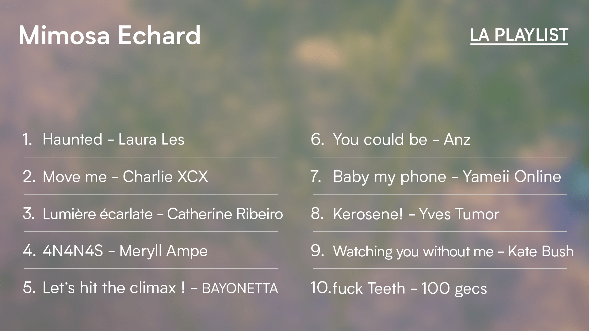 À l’occasion de son exposition “Sporal” au Palais de Tokyo, découvrez l’artiste Mimosa Echard à travers sa playlist acidulé (disponible sur Spotify et Deezer).