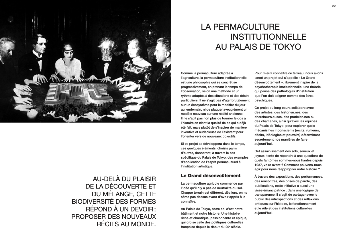 Au travers de ce traité 19 pages, Guillaume Désange président du Palais de Tokyo dresse les 4 piliers de sa permaculture institutionnelle.